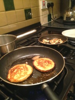 There is always the salmon. I feel bad that I seem to never give my parents any meat. I constantly construct my meals around fish and leftovers, and this is no exception. I spotted some mashed potato in the back and had the idea that to make things a little different I would make breakfast for dinner. I’ve never made potato pancakes before but I thought I would have a go. Potato pancakes, confit salmon, horseradish crème fraiche and green beans with almonds. So I begun by putting a good 3 inches of oil into a deep frying pan with a dash of truffle oil, a squeeze of lemon juice, peppercorns, a bay leaf and some salt. Then I whisked 2 eggs, 125ml milk, salt, pepper, lemon juice, vanilla extract and the mash together before adding a dash of baking powder and 75g flour to create my pancake batter. Then I mixed a large spoonful of horseradish into two spoonful’s of crème fraiche with black pepper and then I dry toasted some flaked almonds. Then I went to the gym, as you do.