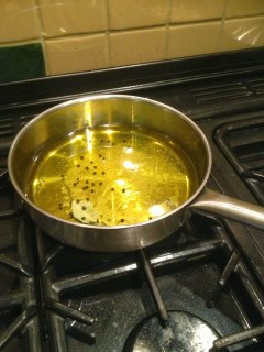 Feeling incredibly, virtuous, sweaty and fired up to the soundtrack of Katy Perry’s ‘Roar’, I set about finishing off the supper. It was quite a simple assembly job at this point. I set the oil to a low simmer and put the salmon in and covered it.