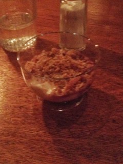 The highlight of the main course was the yorkshire pudding. They had done rather well. It was crispy on top without being burnt and the bottom was soggy in the gravy, but not tough. However it would have been improved even more if we’d been given more gravy, the yorkshire itself was bland (as it should be) and the lack of gravy in which to dip it was lamentable. The beef itself was very very chewy. I’m sure they were trying to cater to everyone’s taste (I understand there are people out there who don’t like to have their steak practically blue) and that it is hard when you’re mass catering to cook anything well but I think you should at least be able to have a conversation while trying to make your way through your meal. The best method for dealing with the main course was a ton of salt, it almost disguised the dodgy textures and definitely made it taste of something.