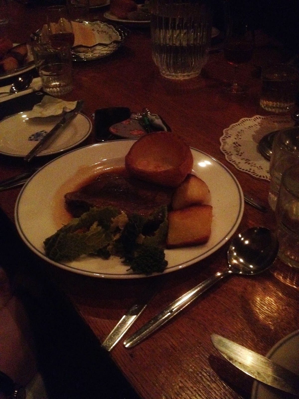 The main was brought promptly (Caius tend to bring things possibly a little too promptly, you feel quite rushed…but at least it means you can get on with your evenings for us busy students) along with dishes laden with potatoes and cabbage which I appreciate because I often wish I had more of a certain thing on a dish. This was slightly let down by the fact the side dishes weren’t inspiring. The cabbage was just cabbage, I can’t fault it except cabbage on its own is never going to be anyones favourite dish and I think everyone would have appreciated salt, butter or in fact anything on that cabbage to make it taste a little less like textured water. The roast potatoes were soggy, yet burnt, although maybe they were trying to evoke the nostalgia of school food pre Jamie Oliver (kids of the 90s), I almost enjoyed them just for old times’ sake.