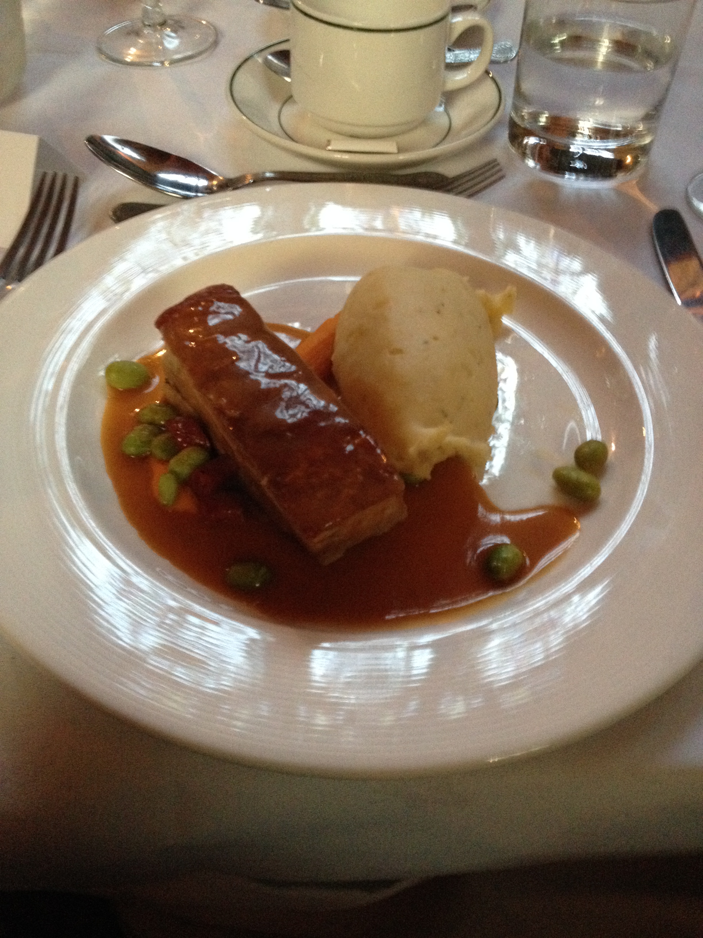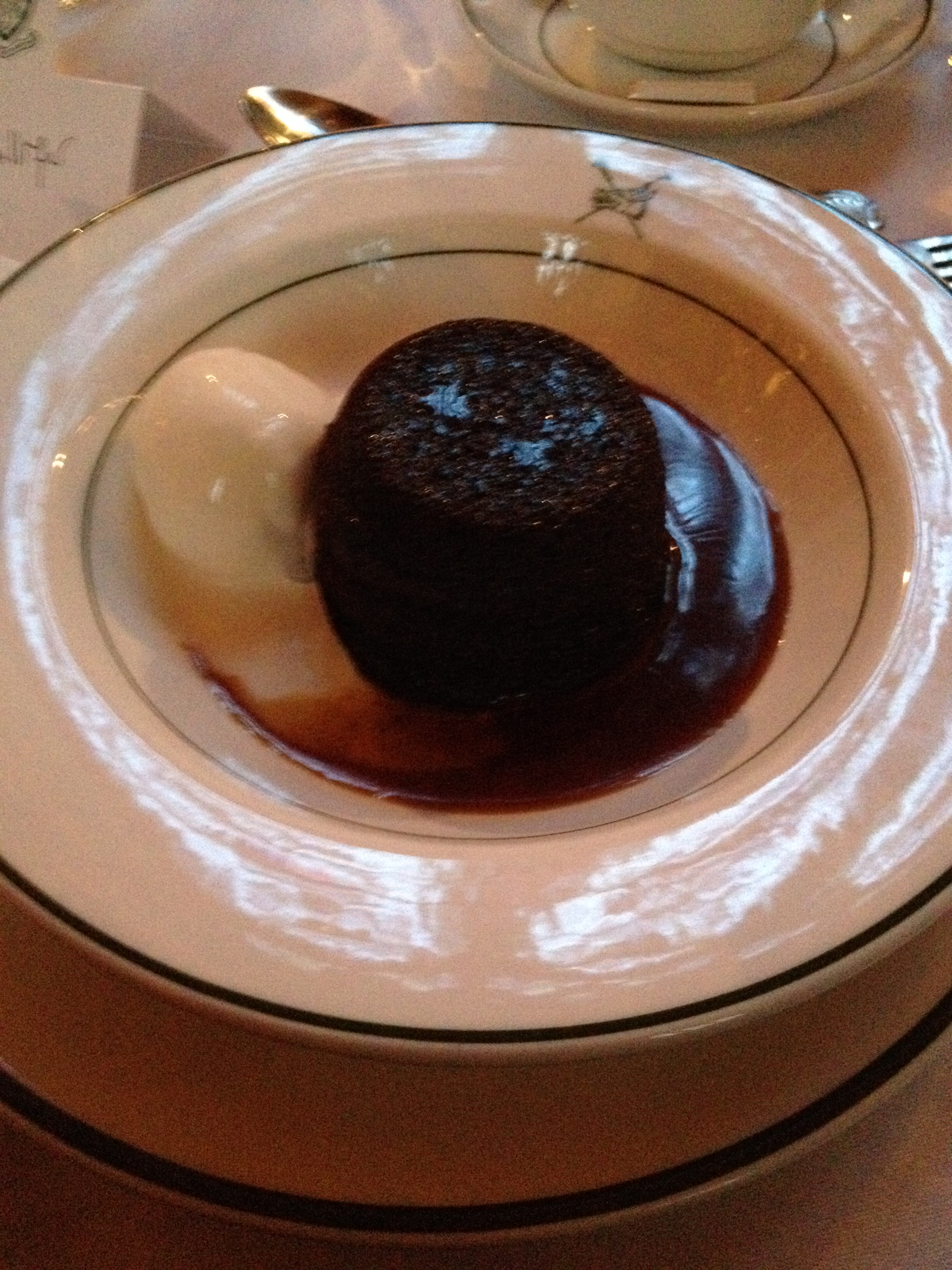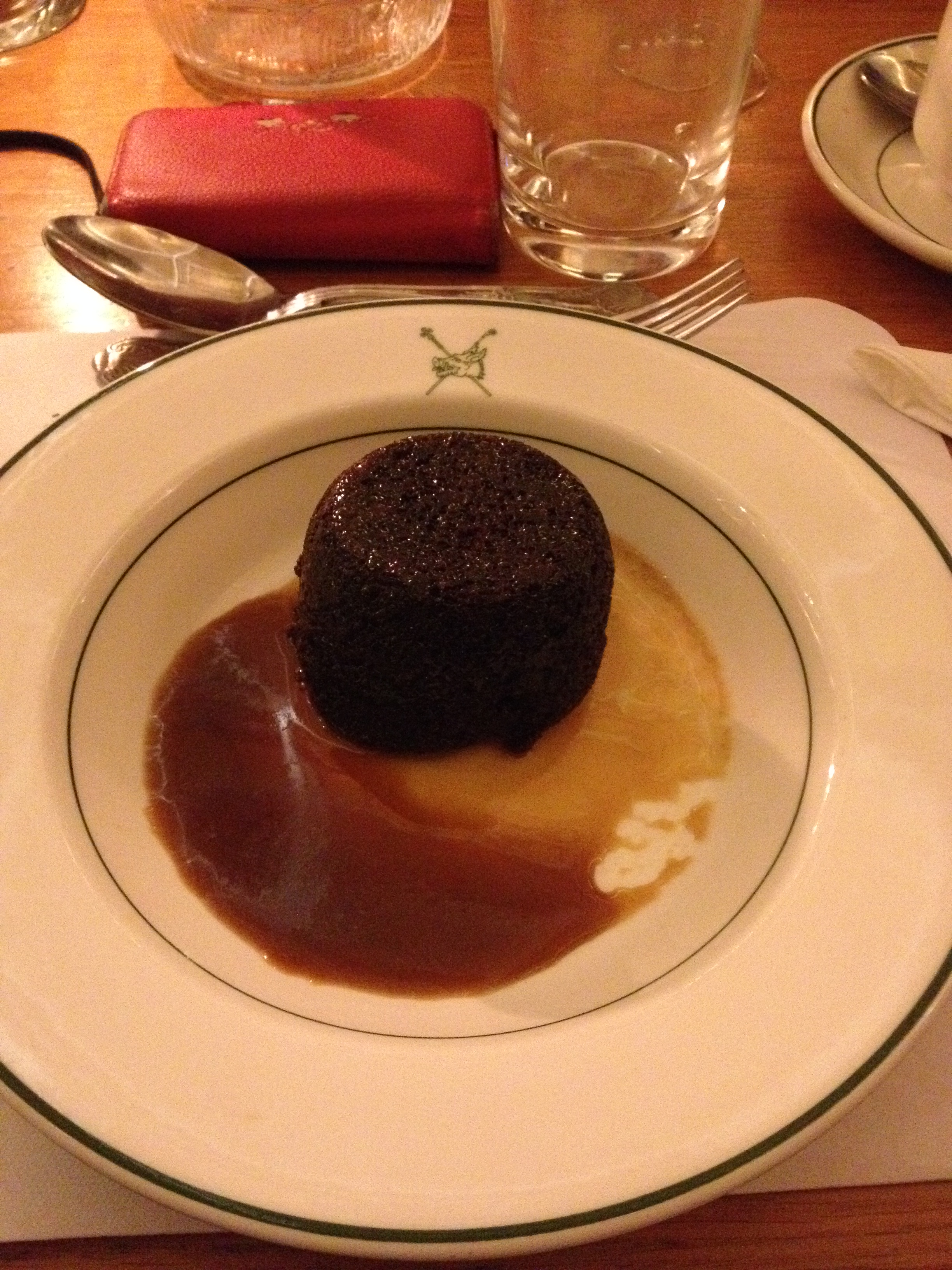 I’m afraid the waitress service did start to get a bit old as each individual component was plated over our shoulder. While Mark Francis next to me commentated that it gave us time to enjoy conversation, company and drink our wine (the red, not as nice as the white but still good) before they came around with top-ups, my lamb failed to maintain 98% of its heat. I was impressed with their potatoes (take note Cauis), crunchy on the outside, fluffy on the inside and well seasoned, although I’m not entirely sure what made them chateau potatoes other than the fact they were served by St John’s. I later found out this means potatoes cut to resemble jewels (which makes a lot more sense). I was equally a fan of the sauce which was sweet and rich and the amazingly al dente green beans, lightly coated in butter. The rather suspicious sounding ‘accompaniments’ turned out to be basic mint sauce and redcurrant jelly – I’m pretty sure all colleges buy the same brand – nothing special. The meat was well seasoned but overdone, I can’t really blame them for that – mass production is not easy.