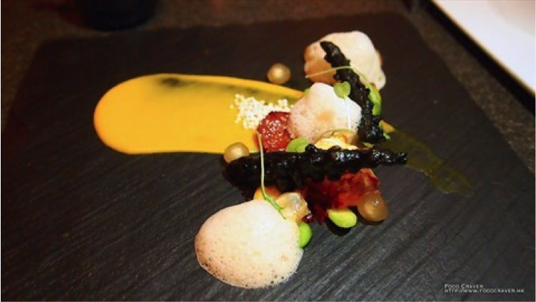 Rare Teriyaki Salmon, garlic, ginger and chilli chickpea mash, Coriander leaves, crispy chilli broccoli.