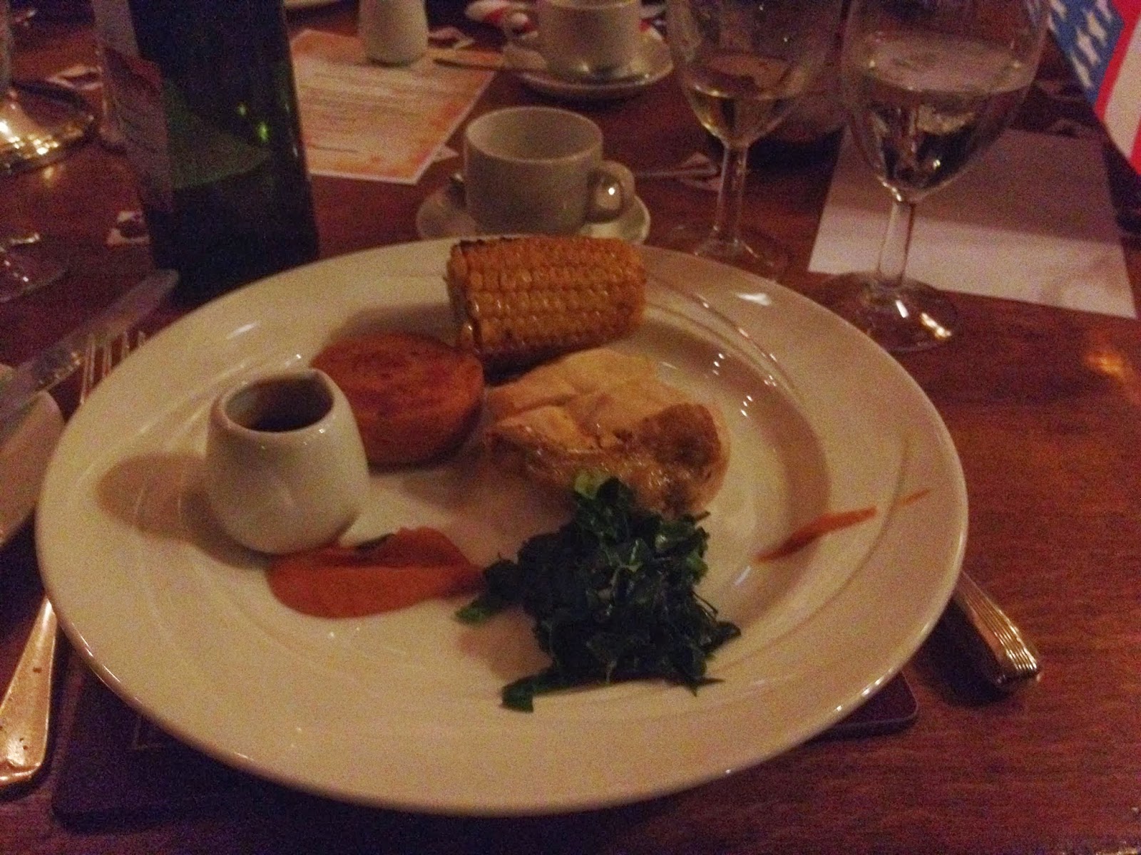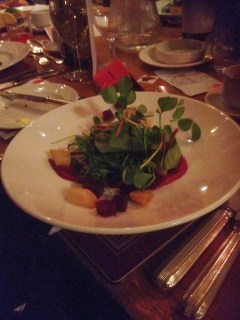 Sitting down at the table, there are two things you notice first. We were given about 12 glasses and there was a beautifully printed menu, with the all the food and wine on one side, and the order of ceremonies on the other side. We started with grace, sung by the choir from the balcony (which on this occasion I happened to be singing in…) Then the food started coming thick and fast. We were first bought Venison, pickled walnuts, beetroot and celeriac Espuma served with Vignier, primavera, P-J Villa, 2011 (a white wine). The venison was smoked and beautifully succulent, the walnuts added a crunch, but it was hard to tell they were pickled, the textures of beetroot worked nicely too, adding sweetness (a favourite of kings) but the Espuma was under-whleming. Having said this, the whole dish was rather good, and this was one time that the tiny Kings portions really worked.